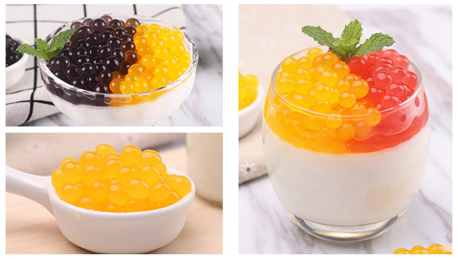 Popping boba is a fashion nutritional food getting popular in recently years. It is also called popping pearl ball or juice ball. Pooping ball use a special food processing technology to cover the juice material inside a thin film and become a ball. When the ball get little pressure from outside, it will break and inside juice will flow out, its fantastic taste is impressive to people. Popping boba can be made in different color and flavor as your requirement. It can be widely applicable in milk tea, dessert, coffee etc.